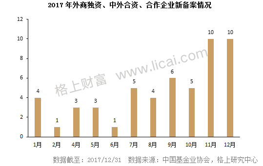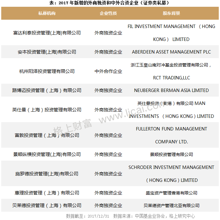 2017年全年新增证券类外商独资和中外合资企业10家,四季度新增6家:安本投资、路博迈投资、景顺纵横投资、施罗德投资、惠理投资和贝莱德投资