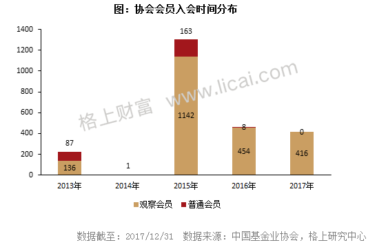 2017年全年协会会员入会数量同比减少46家,今年以来尚无普通会员入会;四季度迎来近两年入会黄金期,272家私募机构入会成为观察会员,环比增加253.25%