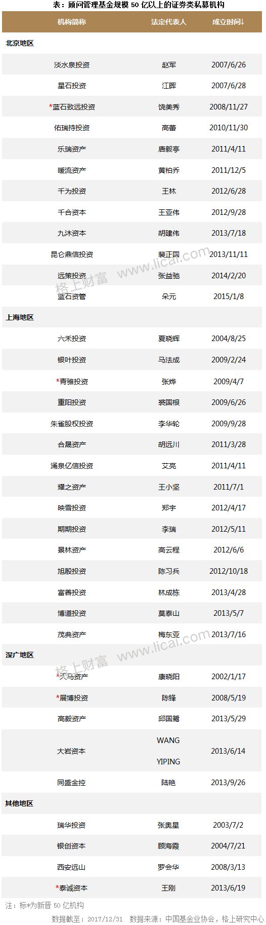 基金业协会备案数据显示,截至2017年四季度末,顾问管理基金规模在50亿以上的证券类私募管理人共36家,75%的机构集中于北京(12家)和上海(15家)两地。值得注意的是本季度有5家私募机构新晋50亿以上规模榜单,包括:蓝石致远投资、青骓投资、天马资产、展博投资和泰诚资本。而骄龙资产顾问管理规模降至20-50亿之间。