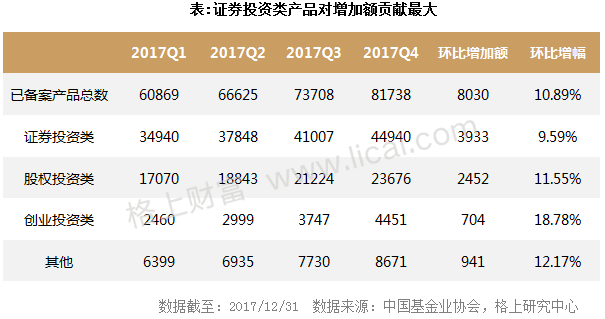 据格上研究中心统计,截至2017年四季度末,在基金业协会已备案产品总数突破8.1万,环比增加10.89%。其中,证券投资类私募产品对增加额贡献度最大,相较三季度增加了3933只,占比约48.97%,股权类私募产品增加了2452只。从增幅来看,创业投资类私募产品数环比增加18.78%,变化幅度最大。