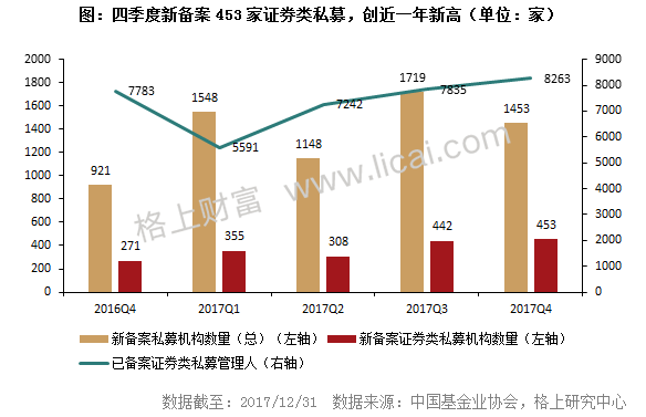 据格上研究中心统计,2017年协会已备案的私募机构共22446家,相较去年增加了5017家,同比增长28.79%。在证券类私募机构备案方面,已备案的证券类私募机构共有8263家,其中四季度新备案453家,创今年以来新高。