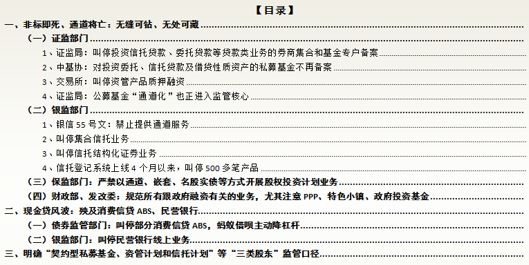 这半年以来,不,严格来说应该是这半个月以来,耳朵里面最多的一个词不是“政策”,是“叫停”、“禁止”、“规范”、“不得”、“应当”这些词汇,它会让你重生的希望成为幻想,让你兴起的幻想彻底无望,因为当您想到包括信托、券商资管、基金专户、私募基金等等在内的传统通道路径全被堵住,以及包括公募基金出让管理权的证券类通道、资管产品不合规的分级设计、无场景ABS以及政府融资的相关业务(如PPP、特色小镇、政府投资基金等)等等也均已经受到明显的政策压制或高压约束时,你除了唏嘘而难以言他。