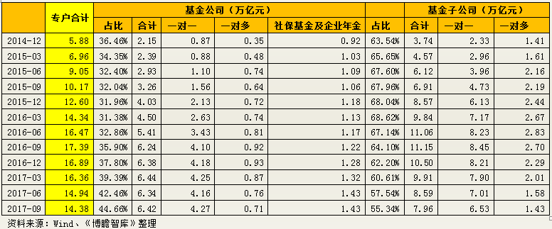 对于基金公司而言,其通道类业务主要由基金子公司来做,基金公司只能投资标准化的资产。可以看出,基金公司的资产管理业务规模约14万亿元左右,而基金子公司在整个基金资产管理业务规模的权重中占比较高,最高甚至接近70%,规模上也一度突破10万亿元,加上券商的定向资管,通道类业务规模约有25万亿元以上。事实上,基金子公司的通道类业务收缩则更早,起源于2016年一季度,目前其在整个基金管理规模中的占比已降至55%。