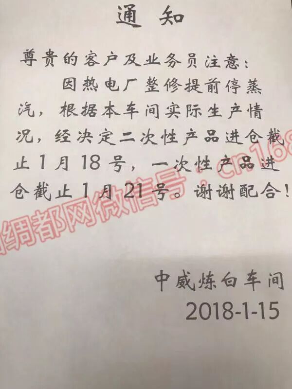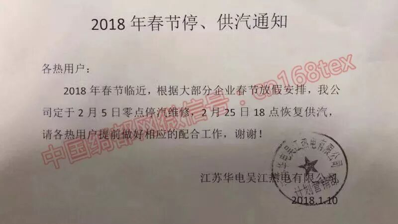 染厂要放假了!随着过年时间的临近,不少印染企业的放假时间也已经基本确定。据悉,近日吴江热电厂已经下发停汽通知。而绍兴地区部分印染企业