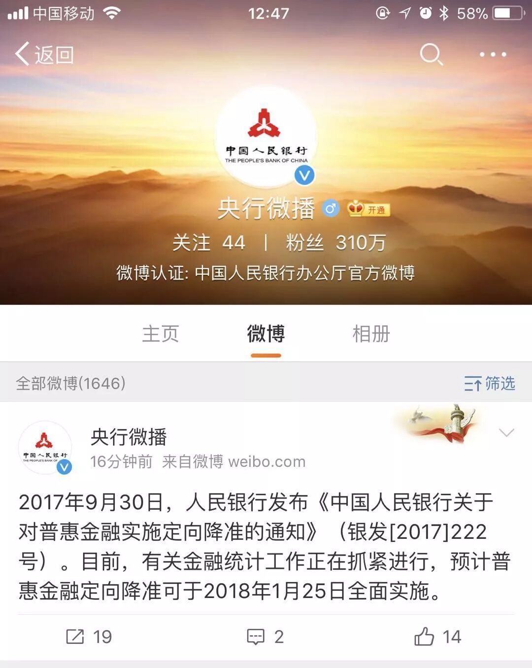 来源 / 中国人民银行官方微博、金融时报记者 张末冬1月17日午间,中国人民银行官方微博发布消息称,2017年9月30日,人民银行发布《中国人民银行关于
