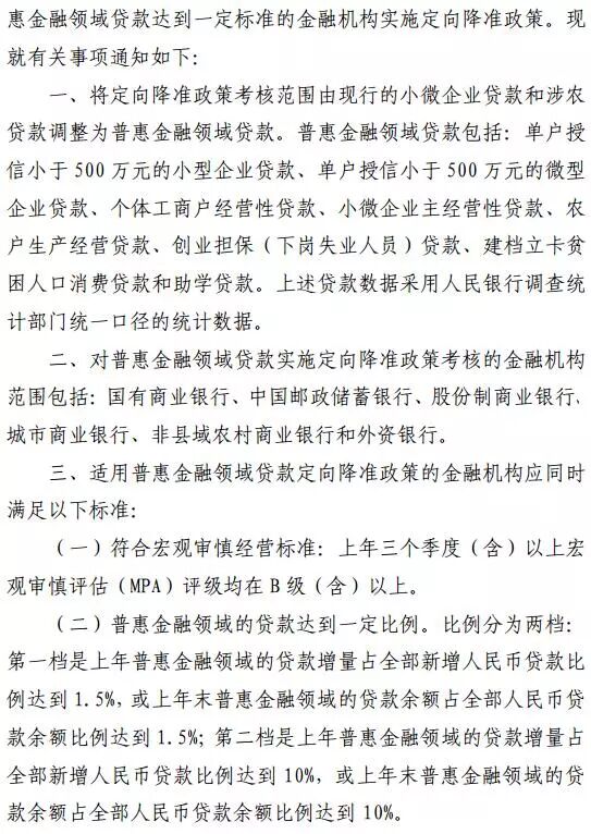 去年9月,央行发布通知提出,根据国务院部署,为支持金融机构发展普惠金融业务,聚焦单户授信500万元以下的小微企业贷款、个体工商户和小微企业主经营性贷款以及农户生产经营、创业担保、建档立卡贫困人口、助学等贷款,人民银行决定统一对上述贷款增量或余额占全部贷款增量或余额达到一定比例的商业银行实施定向降准政策。