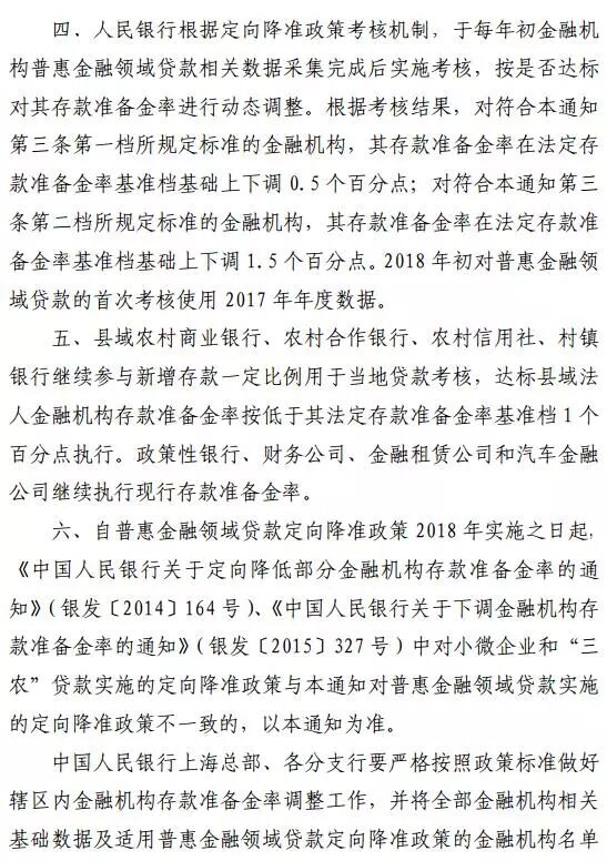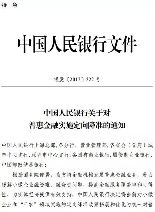 2017年9月30日,根据国务院部署,为支持金融机构发展普惠金融业务,聚焦单户授信500万元以下的小微企业贷款、个体工商户和小微企业主经营性贷款,以及农户生产经营、创业担保、建档立卡贫困人口、助学等贷款,人民银行决定统一对上述贷款增量或余额占全部贷款增量或余额达到一定比例的商业银行实施定向降准政策。凡前一年上述贷款余额或增量占比达到 1.5%的商业银行,存款准备金率可在人民银行公布的基准档基础上下调0.5个百分点;前一年上述贷款余额或增量占比达到10%的商业银行,存款准备金率可按累进原则在第一档基础上再下调1个百分点。上述措施将从2018年起实施。