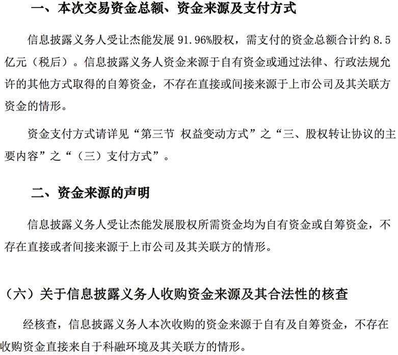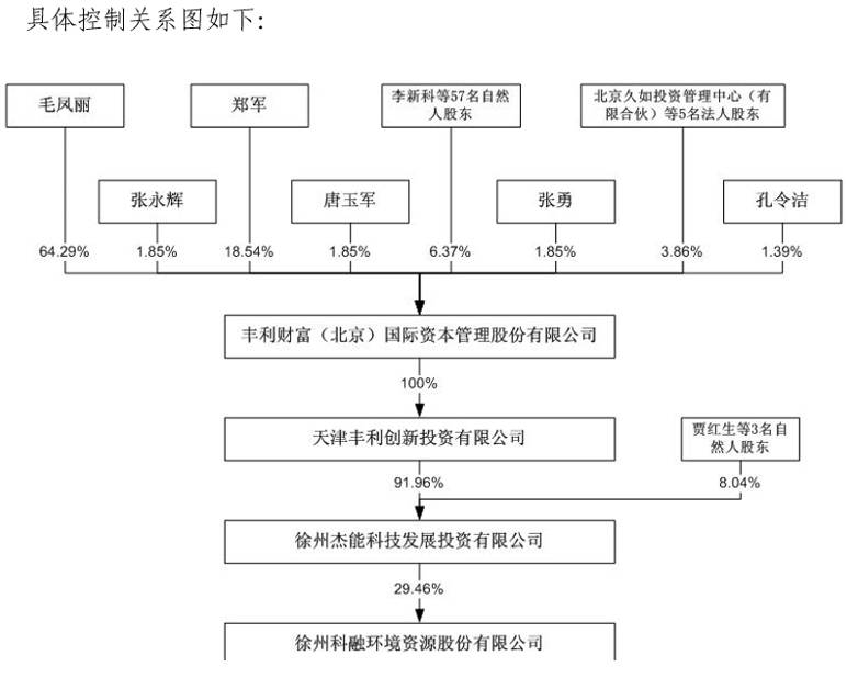 2016年6月28日,科融环境发布《详式权益变动报告书》、《关于控股股东股权结构变化及实际控制人变更的公告》,天津丰利创新投资有限公司拟以 92.4 元/股(税后)的价格受让37名股东所持徐州杰能科技发展投资有限公司91.96%股权,杰能发展持有上市公司 2.1亿股股份,占上市公司总股本的 29.46%。 本次权益变动后,信息披露义务人通过杰能发展间接持有上市公司 2.1亿股股份,占上市公司总股本的 29.46%,并间接控制上市公司。股权转让协议在6月22日签署。