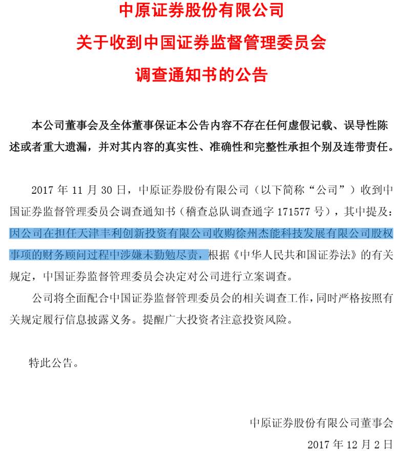 12月1日,中原证券(601375)公告称公司11月30日收到证监会调查通知书,其中提及:因公司在担任天津丰利创新投资有限公司收购徐州杰能科技发展有限公司股权事项的财务顾问过程中涉嫌未勤勉尽责,根据《证券法》的有关规定,证监会决定对公司进行立案调查。