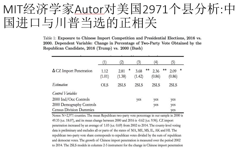 MIT的一个叫Autor的经济学家对美国2971个县做了分析,分析中国进口和共和党选票在两党的选票之中的比例的相关性,结果确实是正相关的。