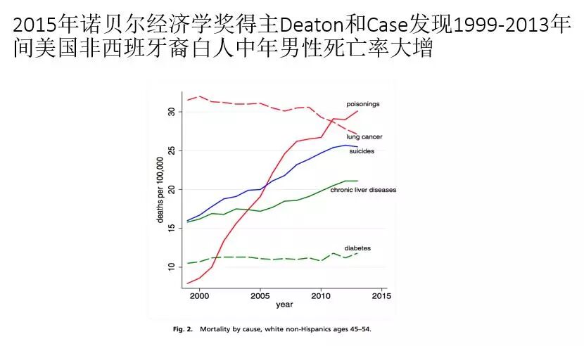 美国的政策是精英制定的,但是结果却要由工人承担。如此就能理解,川普在2016年6月出现在自动扶梯,及他在川普大楼的大厅里激情演讲之后,他在民意调查中跃升第一位,他要尽一切努力让美国再次伟大。2015年诺贝尔经济学奖得主Deaton和他的妻子Case做的一项研究发现,1999-2013年间美国非西班牙裔白人中年男性死亡率大增,这就是所谓的白人工人阶级或者中产阶级的底层不满的一个很重要的原因,死亡的原因里肺癌很多,自杀也比较多。