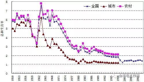 人口学上有一个概念叫"人口转变",转变的一个方面是生育率下降。农村和城市的情况不同,一般来说,城市的生育率更低、下降得更快;农村的生育率较高,下降得较慢。就中国的整体情况来说,生育率下降得非常快。我们从图1中可以看到,中国的总和生育率在在1970年代之前是6,到1980年代初降到了3以下,而独生子女政策却是从1980年代初开始实行的。1980年以后,总和生育率继续下降,很快就降到了2.1的替代水平以下。