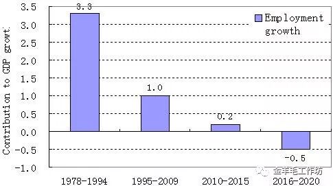 世界银行的高路易做过相关研究,他估算了中国经济在几个时期--1994年以前、1995-2009年、2010-2015年、2016-2020年--的潜在增长率。我借用他的研究,并将其他因素对经济增长的贡献剔除掉,突显就业增长对GDP增长的贡献。1994年之前,就业增长拉动GDP增长了3.3个百分点,大概是当时潜在增长率的三分之一;1995-2009年,降到只有1个百分点,已经很小了,大概是当时潜在增长率的九分之一;2010-2015年"十二五"时期,进一步降到0.2个百分点,已经微不足道;到2016-2020年"十三五"时期,就业增长对GDP的增长贡献为负。这与我们对人口红利的判断完全一致。