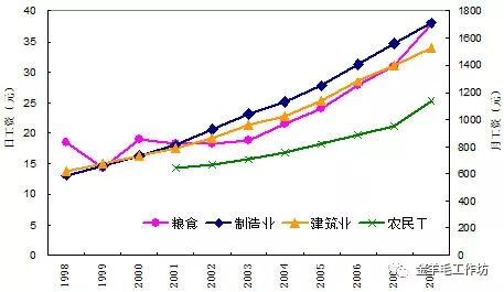 劳动力短缺的结果是工资持续上涨。从2003年开始,一直都是这样的趋势。我们看图10,粮食、制造业、建筑业等行业的普通工人工资持续上涨;各行业农民工的工资也持续上涨。如果我们将农业中雇佣工人的工资列出来,会发现它的上涨速度甚至更快,剔除物价因素之后,平均每年的涨幅高达20%以上。