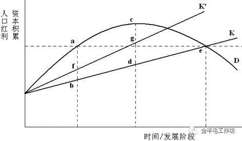 资本积累曲线不是一条水平线,而是斜率为正的一条线:资本积累会越来越多。我们可以假设,人口红利曲线和资本积累曲线之间的距离决定了人口红利促进经济增长的强度。在人口红利达到最高点之前的某一个时点,人口红利对经济的拉动作用最强;在这之后,人口红利的作用会迅速减弱。从图6中我们可以看到,当资本积累曲线是K′时,人口红利的作用较早地消失;而当资本曲线是K时,人口红利作用消失的时间较晚。中国是储蓄率高,资本积累较快的国家,资本积累曲线是K′的可能性更大。