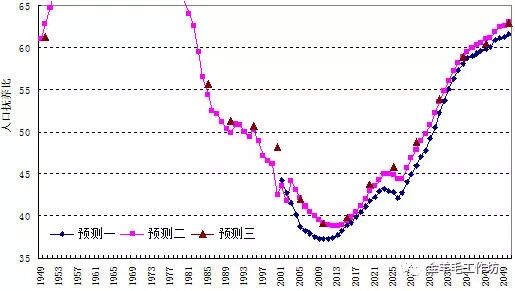 随着老龄化程度的提高,大概在2013年或2015年,抚养比会降到最低点,之后就不再降了,老年抚养比会迅速上升,带动总的抚养比迅速上升。到那时,人口红利将消失。