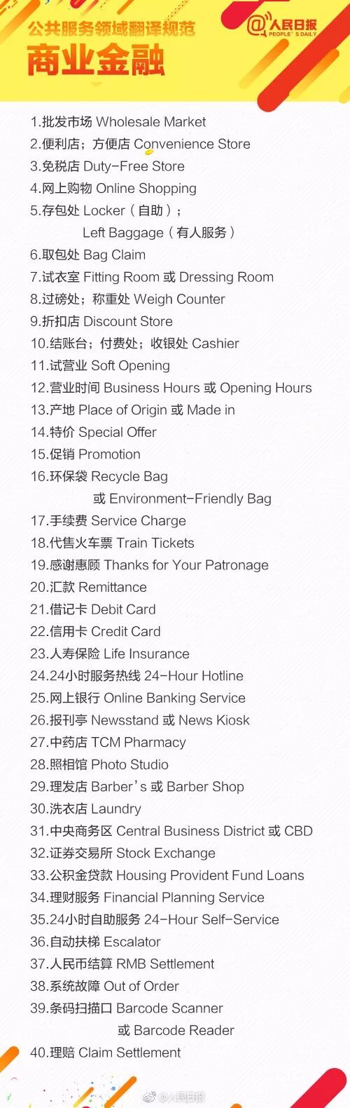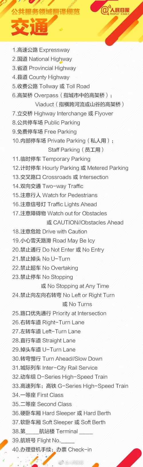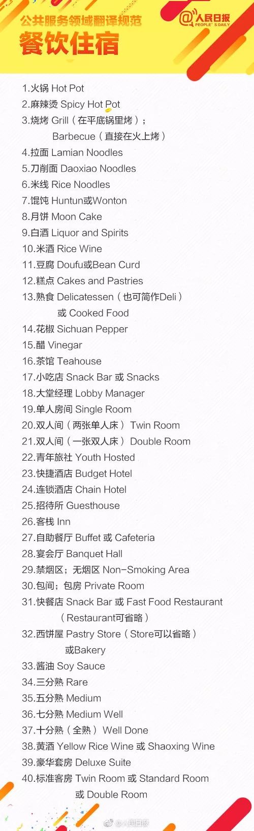 《标准》规定了交通、旅游、文化、娱乐、体育、教育、医疗卫生、邮政、电信、餐饮、住宿、商业、金融共13个服务领域英文译写的原则、方法和要求,提供了常用的数千条规范译文。其中麻辣烫、拉面、豆腐在公共场所的英文翻译都有标准答案了。