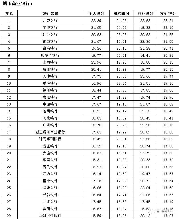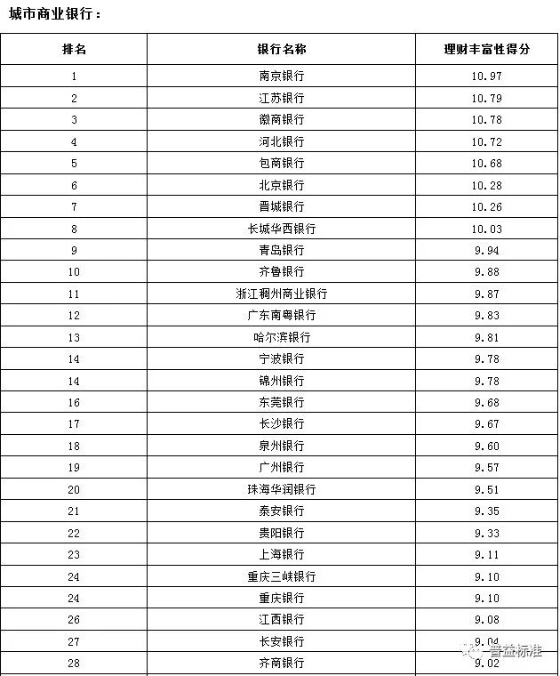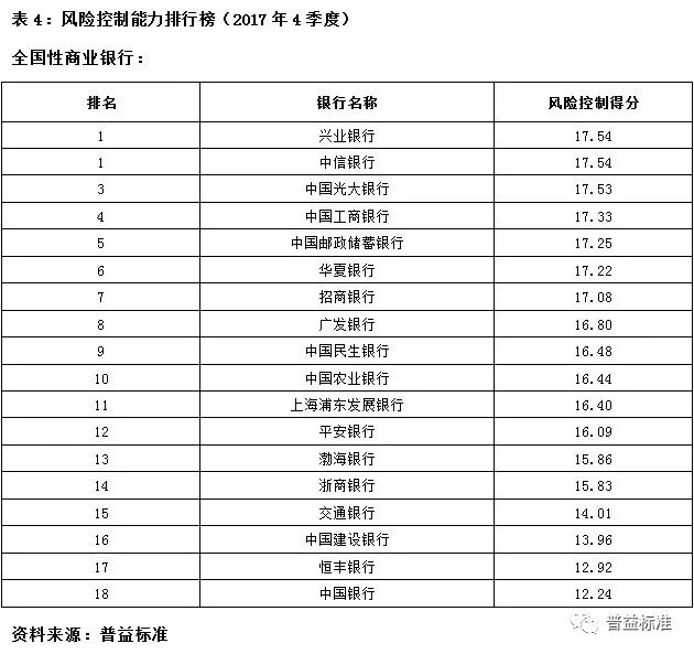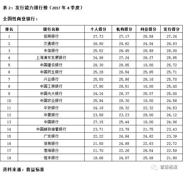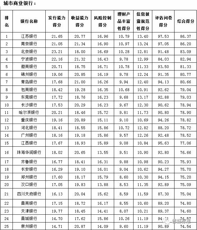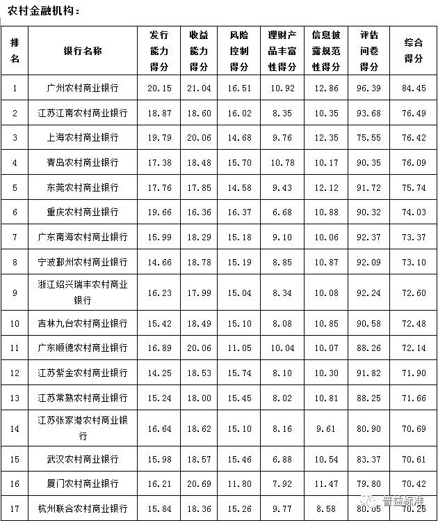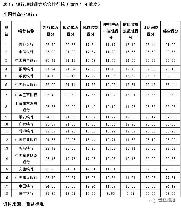 2017年4季度,银行理财能力综合排名和单项排名结果如下: 综合理财能力:全国性银行排名前五的分别为兴业银行、中信银行、中国民生银行、招商银行和华夏银行;城市商业银行排名前十的分别为江苏银行、南京银行、北京银行、宁波银行、徽商银行、锦州银行、青岛银行、包商银行、东莞银行和长沙银行;农村金融机构排名前十的分别为广州农商银行、江苏江南农商银行、上海农商银行、青岛农商银行、东莞农商银行、重庆农商银行、广东南海农商银行、宁波鄞州农商银行、浙江绍兴瑞丰农商银行和吉林九台农商银行。 发行能力:全国性银行排名前五的分别为招商银行、交通银行、中信银行、上海浦东发展银行、中国建设银行;城市商业银行排名前十的分别为北京银行、宁波银行、江苏银行、南京银行、徽商银行、哈尔滨银行、上海银行、杭州银行、天津银行、重庆银行;农村金融机构排名前十的分别为广州农商银行、上海农商银行、重庆农商银行、江苏江南农商银行、北京农商银行、东莞农商银行、青岛农商银行、广东顺德农商银行、江苏张家港农商银行、浙江绍兴瑞丰农商银行。 收益能力:全国性银行排名前五的分别为兴业银行、华夏银行、上海浦东发展银行、渤海银行、平安银行;城市商业银行排名前十的分别为南京银行、宁波银行、青岛银行、九江银行、重庆银行、泉州银行、锦州银行、江苏银行、珠海华润银行、长城华西银行;农村金融机构排名前十的分别为广州农商银行、厦门农商银行、上海农商银行、广东顺德农商银行、宁波鄞州农商银行、江苏张家港农商银行、江苏江南农商银行、武汉农商银行、江苏紫金农商银行、吉林九台农商银行。 风险控制能力:全国性银行排名前五的分别为兴业银行、中信银行(并列第一)、中国光大银行、中国工商银行和中国邮政储蓄银行;城市商业银行排名前十的分别为江苏银行、南京银行、徽商银行、北京银行、宁波银行、包商银行、齐鲁银行、青岛银行、东莞银行和长沙银行(并列第九);农村金融机构排名前十的分别为广州农商银行、重庆农商银行、江苏江南农商银行、江苏紫金农商银行、青岛农商银行、武汉农商银行、珠海农商银行(并列第六)、江苏常熟农商银行、杭州联合农商银行、山西河津农商银行。 理财产品丰富性:全国性银行排名前五的分别为交通银行、中国民生银行、招商银行、中国银行以及平安银行;城市商业银行排名前十的分别为南京银行、江苏银行、徽商银行、河北银行、包商银行、北京银行、晋城银行、长城华西银行、青岛银行和齐鲁银行;农村金融机构排名前十的分别为广州农商银行、青岛农商银行、广东顺德农商银行、杭州联合农商银行、上海农商银行、东莞农商银行、广东南海农商银行、宁波鄞州农商银行、江苏江南农商银行、浙江绍兴瑞丰农商银行。 信息披露规范性:全国性银行排名前五的分别为中国民生银行、华夏银行、中信银行、兴业银行和中国工商银行;城市商业银行排名前十的分别为江苏银行、南京银行、东莞银行、宁波银行、河北银行、北京银行、青岛银行、长沙银行、广东华兴银行、广州银行;农村金融机构排名前十的分别为广州农商银行、上海农商银行、东莞农商银行、厦门农商银行、重庆农商银行、宁波鄞州农商银行、吉林九台农商银行、江苏南通农商银行、江苏常熟农商银行(并列第八)、亳州药都农商银行。 分类指标测度 收益能力:全国性银行排名前五的分别为兴业银行、华夏银行、上海浦东发展银行、渤海银行、平安银行;城市商业银行排名前十的分别为南京银行、宁波银行、青岛银行、九江银行、重庆银行、泉州银行、锦州银行、江苏银行、珠海华润银行、长城华西银行;农村金融机构排名前十的分别为广州农商银行、厦门农商银行、上海农商银行、广东顺德农商银行、宁波鄞州农商银行、江苏张家港农商银行、江苏江南农商银行、武汉农商银行、江苏紫金农商银行、吉林九台农商银行。 风险控制能力:全国性银行排名前五的分别为兴业银行、中信银行(并列第一)、中国光大银行、中国工商银行和中国邮政储蓄银行;城市商业银行排名前十的分别为江苏银行、南京银行、徽商银行、北京银行、宁波银行、包商银行、齐鲁银行、青岛银行、东莞银行和长沙银行(并列第九);农村金融机构排名前十的分别为广州农商银行、重庆农商银行、江苏江南农商银行、江苏紫金农商银行、青岛农商银行、武汉农商银行、珠海农商银行(并列第六)、江苏常熟农商银行、杭州联合农商银行、山西河津农商银行。 理财产品丰富性:全国性银行排名前五的分别为交通银行、中国民生银行、招商银行、中国银行以及平安银行;城市商业银行排名前十的分别为南京银行、江苏银行、徽商银行、河北银行、包商银行、北京银行、晋城银行、长城华西银行、青岛银行和齐鲁银行;农村金融机构排名前十的分别为广州农商银行、青岛农商银行、广东顺德农商银行、杭州联合农商银行、上海农商银行、东莞农商银行、广东南海农商银行、宁波鄞州农商银行、江苏江南农商银行、浙江绍兴瑞丰农商银行。 信息披露规范性:全国性银行排名前五的分别为中国民生银行、华夏银行、中信银行、兴业银行和中国工商银行;城市商业