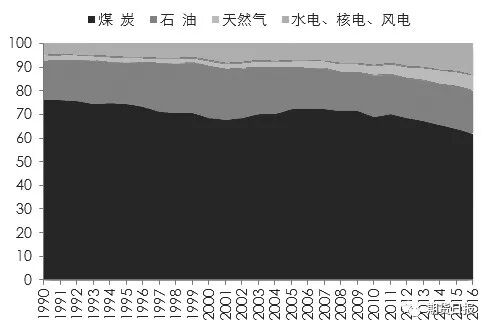 煤炭作为主要的能源,2007年,其占一次能源消费量的比例达到72.5%,而近年来,天然气、水电、核电、风电等新能源消费量逐步增长。2016年,煤炭占一次能源消费量的比例降至62%,延续下滑势头。