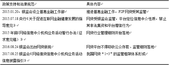 目前网贷已成为一种有效的补充金融形式,是民间金融的窗口,网贷行业发展过程中所出现的问题也受到了政府部门的关注。我国已经将互联网金融纳入“十三五”规划,对外正式提出要“规范发展互联网金融”。发展至今我国出台了各种支持型和规范性的政策支持和法律规范。