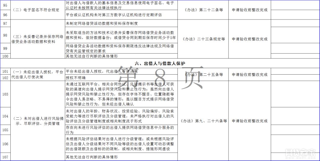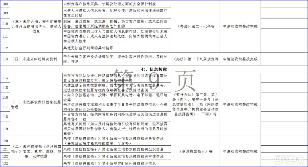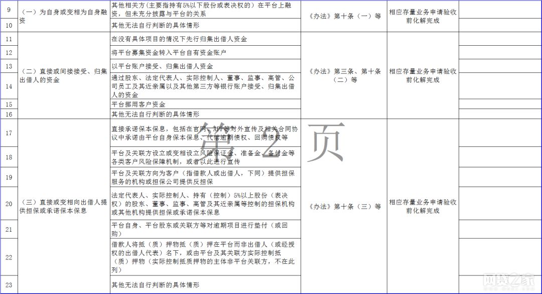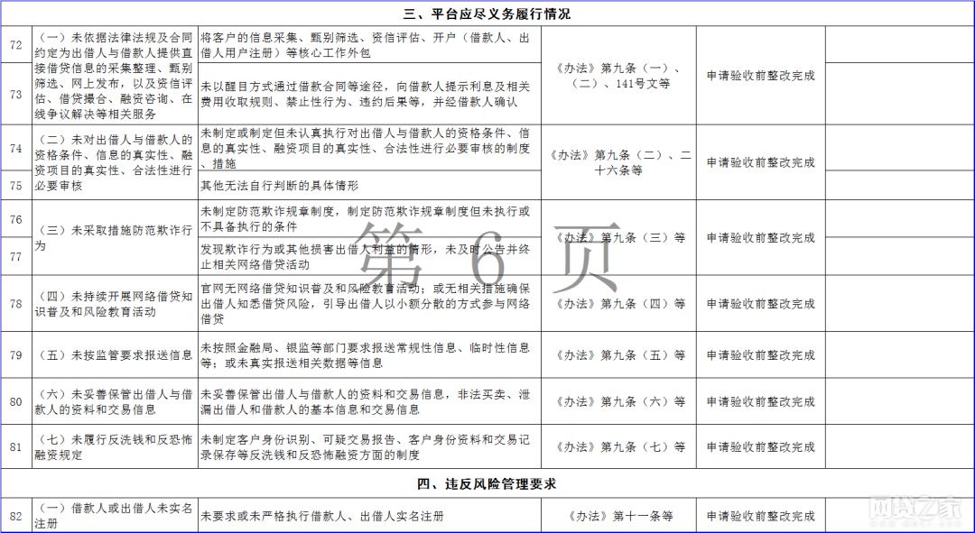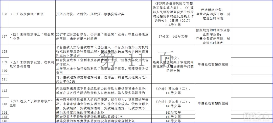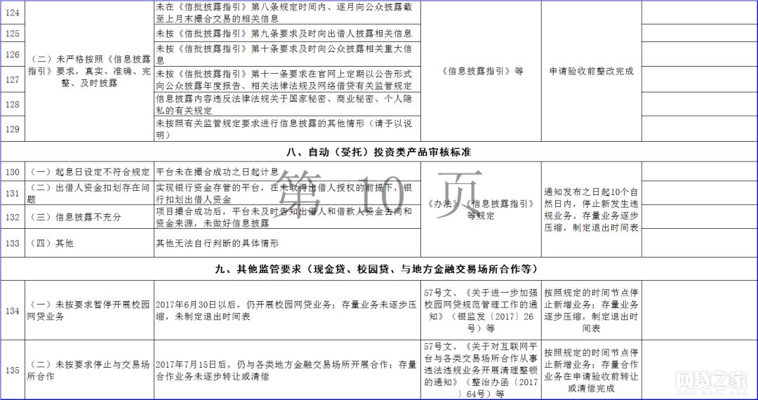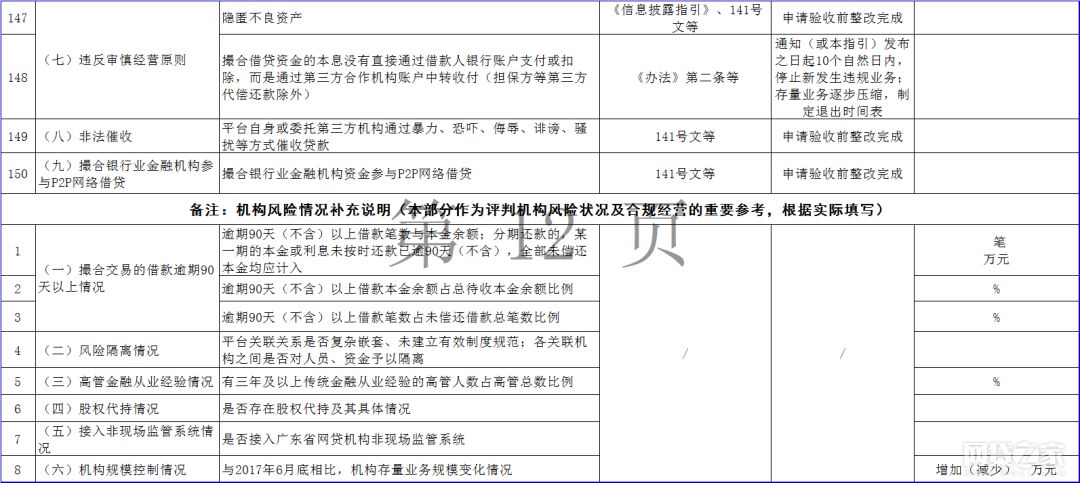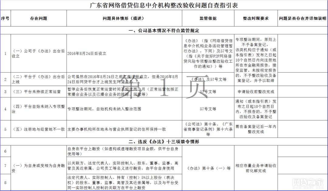 据悉,该通知包括《广东省网络借贷信息中介机构整改验收问题自查指引表》(以下简称“自查指引表”)、《广东省网络借贷信息中介机构整改验收自评报告编写说明》、《广东省网络借贷信息中介机构专项审计报告编写指引》、《广东省网络借贷信息中介机构整改合规情况法律意见书编写指引》四份文件,其中自查指引表提出158条P2P网贷整改验收指引。