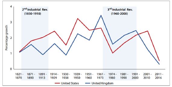 ▲1821-2016年期间英国和美国劳动生产力年增长率 数据来源:UN/DESA