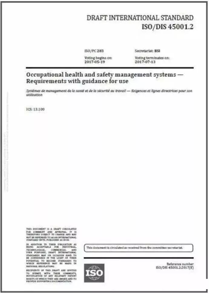 ISO 45001《职业健康安全管理体系 要求及使用指南》DIS2草案已于2017年5月19日发布,目前,ISO 45001现已进入最终国际标准版草案(FDIS)阶段,预计将于2018