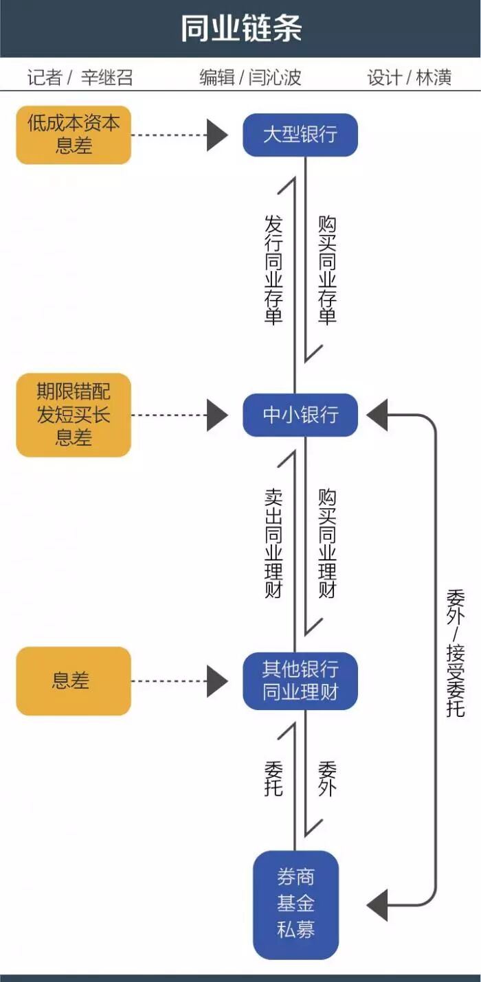 导读:大型银行获得低成本资金后,向股份制银行、城商行等中小银行购买同业存单等同业产品,中小银行以此获取的资金,在用以委外投资、购买其他更高风险偏好的银行发行的同业存单或同业理财。在这一同业链条中,资金通过“大行—中间银行—中小银行—小银行”层层传递,同业链条通过农商行为代表的中小行加长,银行间资金大量流入债市等金融市场。