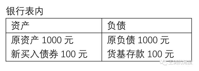 接上例,回表之后,客户不满足于存款,如果去买了货币基金(或其他机构的类似资管产品)100元。一开始,则是客户存款变成货币基金在银行的存款: