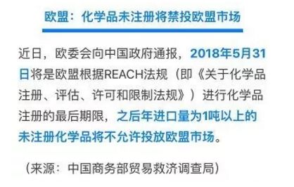 重要通知!外贸人请注意!欧盟即将出台新规,针对年进口量为1吨以上的未注册化学品将不允许投放欧盟市场!该法规于2018年5月31日起实施。望各外贸
