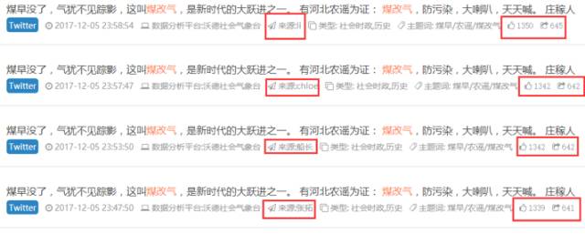 从各平台数据占比来看,微博是主要的发声渠道,占比高达54%,可见普通网民对该项政策的讨论热情和参与度之高;客户端和网页的数据占比紧随其后,主要以媒体报道为主;此外,境外社交平台(主要是Twitter和Facebook)的数据排在第四位,通过整理分析后发现一些人有组织的以此次供暖危机炒作造谣,将煤改气政策说成是新时代的“大跃进”,其背后目的值得有关部门密切关注。