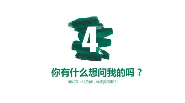 最后一个问题,最好不要真的当问题环节来走,而是通过这个环节,给自己加加分。比如,你可以问一个能够暗示面试官,你非常想获得这个工作的问题:“我想知道如果有幸进入公司,我的发展方向是怎样的呢?”或者,“我们部门的氛围是什么样的呢?”等等。