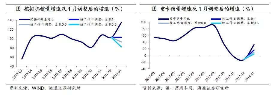 挖掘机数据经过工作日调整之后,在三种情景下1月同比增速分别为103%、92%和82%,较初始的135%有所降低,但从绝对水平看,依然整体保持了17年4月以来的较高增速。