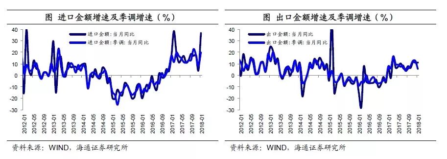海关总署在公布外贸数据的初始值时,同时公布了进出口的季调增速,18年1月季调后的进、出口增速均较初始值明显降低。未季调前1月的进口同比从17年12月的4.5%跃升到36.9%,而季调后的增速则是从8.7%增加到20.4%,可以看到进口依然是较12月的低位明显反弹,不过增速只是回到17年10-11月的水平,而不是11个月的新高。季调后1月的出口增速从初始值11.1%下降到5.6%,从稳中提升变为增速回落,意味着春节时间的错位同样使得今年1月的出口增速被高估。