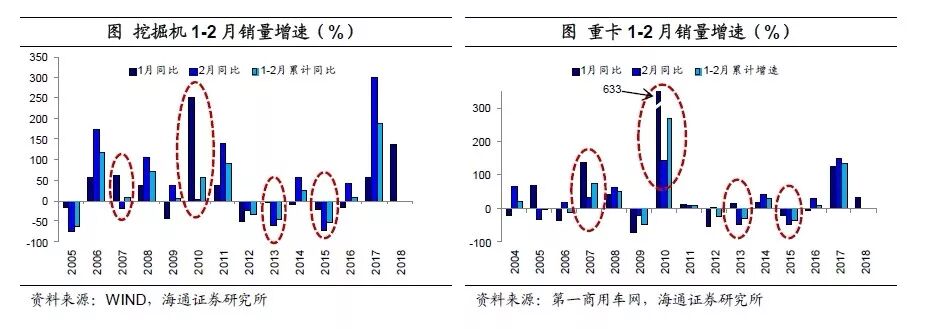 这一规律在07、10、13、15年都得到很好的印证:07和10年1月挖掘机销量分别高增62%和250%,但2月销量增速分别转负(-19%)和低增(2%),1-2月累计增幅仅7%和56%,13和15年1月,挖掘机销量跌幅分别为-4%和-21%,也都远小于这两年1-2月的累计同比-47%和-56%。07、10年重卡销量1月增速都是1-2月累计增速的两倍左右,13年1月重卡销量同比增加13%,而1-2月累计下降29%。