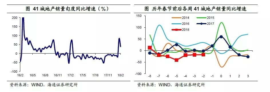 然而地产需求果真大幅复苏么?通过对比历年春节前后各周41城地产销量增速,我们发现,在18年春节前7周到前2周41城销量周度同比增速均处历年同期低位水平。剔除春节效应的1月41城地产销量增速仅有-29%,相比于17年11月和12月-6.5%、-11%的销量增速跌幅加深。而1月5大龙头房企地产销售面积增速从12月的73%降至38%也印证了1月地产需求并没有出现大幅反弹。