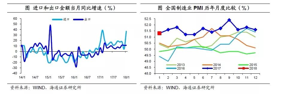 18年经济开局如何?由于统计局将1月的重要经济数据和2月合并发布,因此年初经济的真实情况在3月才能终见端倪。而从现有数据的表现来看,1月经济开局平稳,运行良好,且不乏亮点。1月中采制造业PMI虽下滑至51.3%,但处于历年同期高位,财新制造业PMI不仅同样处于同期高点,并且持平在17年9月以来的高位。从进出口贸易来看,出口增速略升至11.1%,外需依然强劲,而进口增速跳升至36.9%,似乎指向内需也大幅改善。