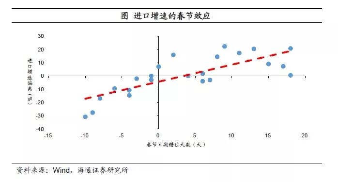 18年初进口数据的跳升即与“春节效应”有关。我们统计了从1995年到2017年每年的春节时间,并将2月1日作为基准来衡量春节在公历日期上的错位天数。我们发现,春节日期越晚,1月的进口增速相比于1-2月进口增速均值的正向偏离程度就越大。也就是说,春节日期的推迟可能会造成1月进口增速的“虚高”。