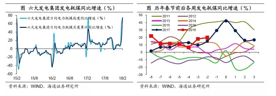 通过对比历年春节前后各周的数据来剔除“春节效应”影响,我们发现,经调整后的18年1月发电耗煤同比增速只有11%,涨幅相对温和。但18年六大发电耗煤增速在春节前第二周增速升至20%,且节前第三周和第二周增速明显处于历年同期较高水平,而开工率数据表明工厂节前已逐渐放假停产,较高的发电耗煤增速可能同气温下降、冷空气活动频繁导致生活用电增加有关。