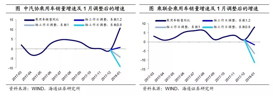 三种情景下的计算显示,经过实际工作日调整之后,乘用车的消费需求依然较弱。按照假设的三种情景下,中汽协乘用车销售增速从初值10.7%分别降至了0.7%、-4.4%和-9.4%,仅自乐观情景下的增速较12月回升。而乘联会乘用车销售增速从初值8.2%分别下降至-1.6%、-6.6%和-11.5%,较12月增速均进一步下滑。这一结果与前文用周度数据调整的结论指向一致,均说明1月乘用车的需求大概率稳中偏弱。