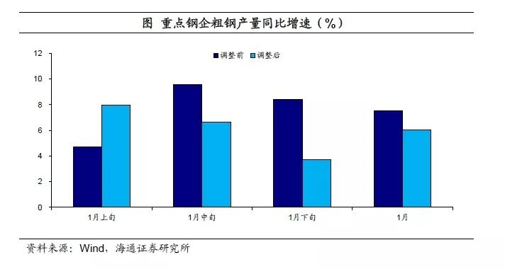 其次在工业生产方面,从钢铁产量来看,1月重点钢企粗钢产量同比增速7.5%,较17年12月的4.1%有所回升,且1月中下旬重点钢企粗钢产量旬度同比增速均超过8%。而经过春节效应剔除后,1月重点钢企粗钢产量旬度同比增速呈逐旬下滑,且上中下旬增速均在8%以下,剔除春节效应后的1月增速在6%,虽较调整前有所下降,但同样超过17年12月的未调整值,可见钢铁生产端在1月确有改善。