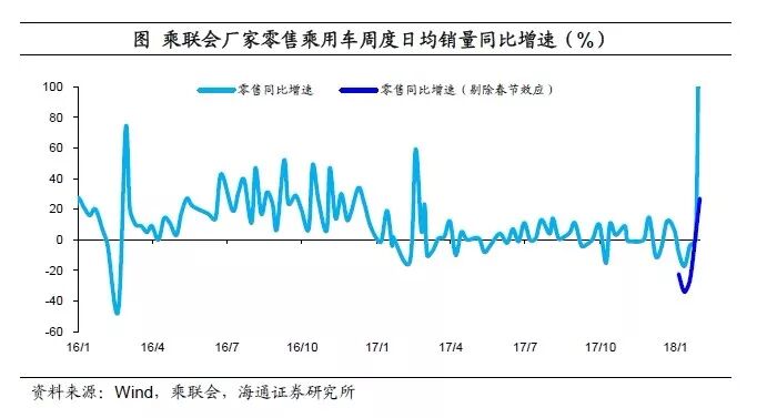 从乘用车零售情况来看,18年1月最后一周乘联会厂家零售日均销量增速大幅跃至194%,因此带动1月乘用车厂家零售销量同比增速升至8.1%,远超17年12月的1.2%。但是经过剔除春节效应的调整后,18年1月最后一周零售销量增速27%,虽仍有回升却并没有达到超过100%的水平,且1月前三周增速均比调整前跌幅加深。剔除春节效应后,1月乘用车厂家零售销量增速-14%,可见1月乘用车零售非但并无反弹,而且下滑至低位,需求依然偏弱。