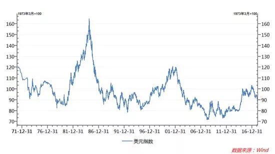 从美元历史走势看(见下图),尽管呈现阶段性、周期性的涨跌,但总体趋势是下行的,美元内在的贬值机制效应明显。