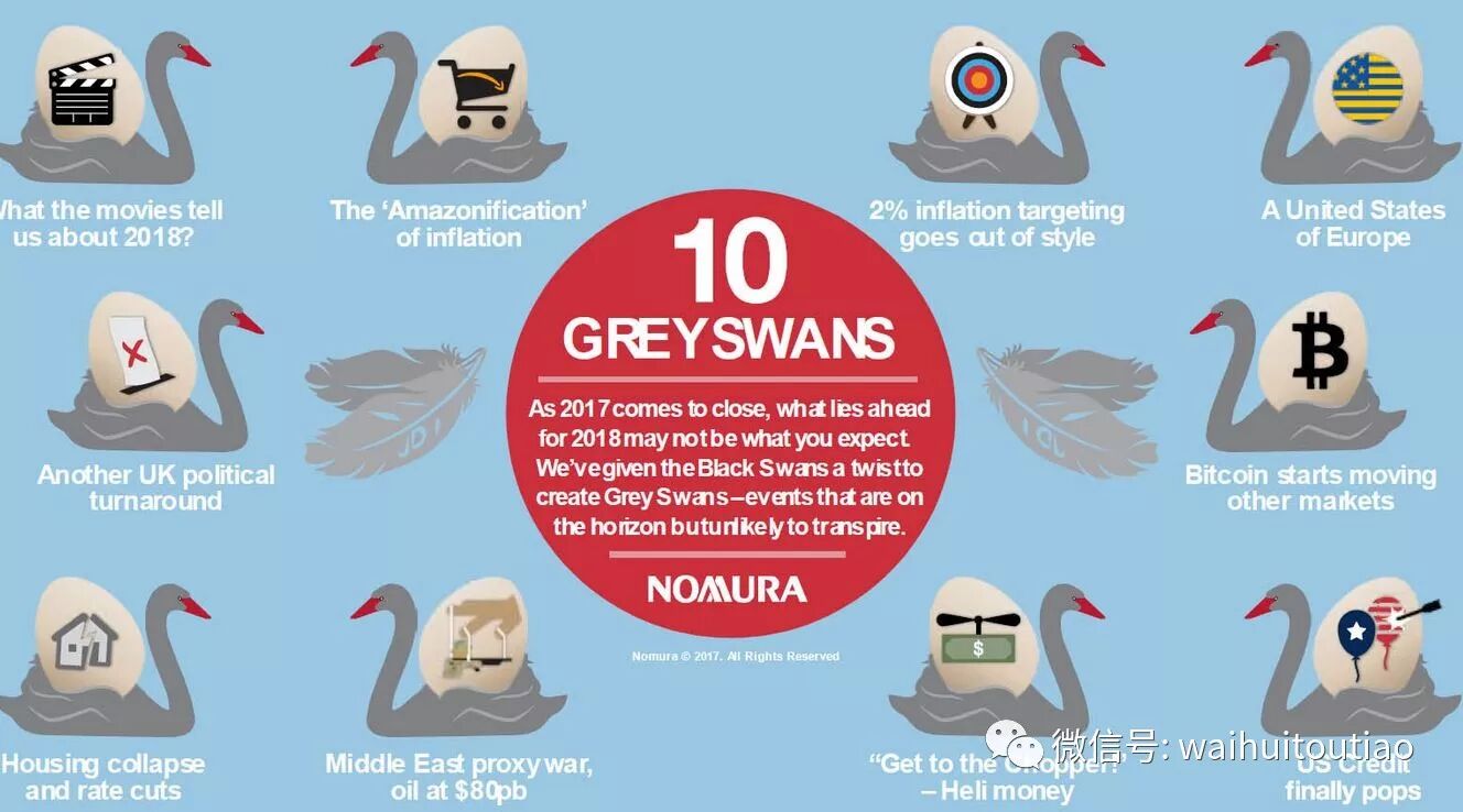 野村证券的分析师Bilal Hafeez认为,从定义上看,黑天鹅事件难以预测;因此,该分析师发明了一个新的词汇:灰天鹅!Bilal Hafeez将灰天鹅定义为:看起来不太可能会发生;一旦发生影响力巨大;没有被市场分析师纳入常规的基本面分析范畴。根据