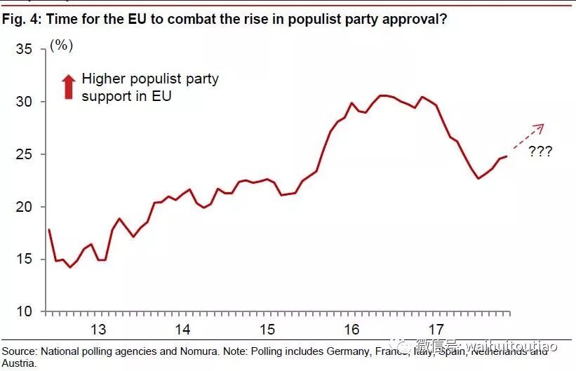 鉴于2016-2017年发生的一系列事件,欧元区在2018年有可能在政治上达成跟紧密的联盟。英国退欧、法国和意大利的民粹主义崛起等等,都给欧盟领向“联邦”靠拢提供契机。