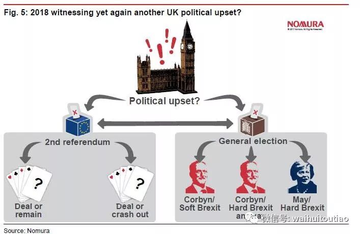 Bilal Hafeez 调侃称,在预测英国政局是,有点一朝被蛇咬十年怕井绳(注:在2017年初刚发布报告称,英国政局平稳年内无事,两周之后Theresa May 就宣布大选)。野村证券认为,英国政局最有可能出现的黑天鹅是出现退欧第二次公投。