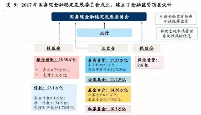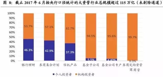 从各资管产品底层资产的分布结构看,理财、券商集合资管、券商定向主动产品以标准化资产为主,非标资产占比不足20%; 而信托、券商通道业务和基金子公司以非标资产为主,非标准化资产占比超过80%。具体而言: • 银行理财:截止2017上半年,标准类债券占到42.5%,非标债权占比16.1%,现金及银行存款占15%,此外,权益投资、拆放同业和买入返售、同业存单、公募等也占比各在3-10%左右。 • 信托产品:截止2017年9月,标准化证券资产的占比仅14.3%,而贷款、股权投资、买入返售等非标类资产占到超过50%。 • 基金子公司:截止2016年末,标准化资产股票、债券等占比仅13.1%,非标资产(委托贷款、收益权、信托计划等)占比达71.1%。 • 公募基金和基金专户:标准化资产占100%。 • 券商资管:各类型资管产品差异巨大, a)集合计划以标准化资产为主,债券占到63%,协议存款、股票、基金分别占5-8%,非标资产占比不足10%; b)主动定向产品也以标准化资产为主,债券占比55.7%,股票、基金等占10%,而信托计划等非标资产占比不足15%。 c)定向通道业务则以非标资产为主,信托贷款、资产收益权、票据等占比超过75%,而证券投资仅占15.8%。 从投资者结构看,银行理财、券商资管集合计划中个人投资者占比相对较高,超过40%,分别达46.3%和42.9%,信托产品中以个人投资者为主的集合产品占到37.3%。而基金子公司、基金专户、券商定向资管的投资者结构中,机构投资者占比高达94.5%、95.6%和99.7%,这其中以银行和信托委托资金的比例分别达到68.5%、64.9%和86.4%,占据绝对优势。 严监管和防风险是贯穿2017年全年的关键词。过去5年在大资管快速膨胀过程中,各方金融监管也呈现竞相放松之势,业务、产品、结构和通道创新层出不穷,跨部门、跨行业进行监管规避和套利。 但2017年国务院金融稳定发展委员会成立,标志着对金融统筹监管和监管协调建立了顶层设计,各方监管也开始竞争性紧缩,发布一系列严厉政策,致力于化解资管领域金融风险。 2017年的重要金融监管政策进行全面梳理,分析各政策对流动性、债市、银行、大类资产等领域的影响,有利于投资者回顾和把握金融严监管下的政策思路和市场方向。 文章来源:东方财经网