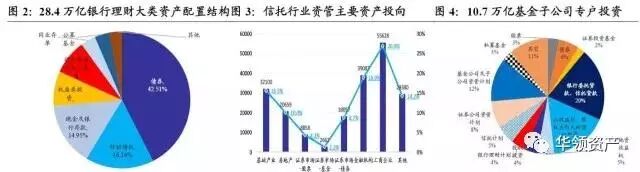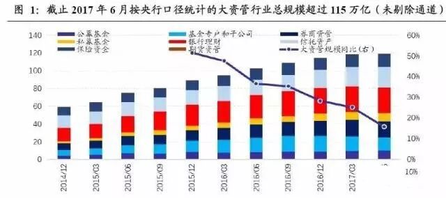 资管扩张速度连续多年保持50%以上,根据央行口径统计,2017年大资管行业总规模已突破100万亿(部分重复计算),其中,银行表内、表外理财余额为6.75万亿、21.63万亿,信托资产余额23.1万亿,公募、券商资管、基金专户和子公司、私募规模分别为11.14万亿、17.37万亿、14.4万亿和10.3万亿,创造出了极为宽松的信用环境。