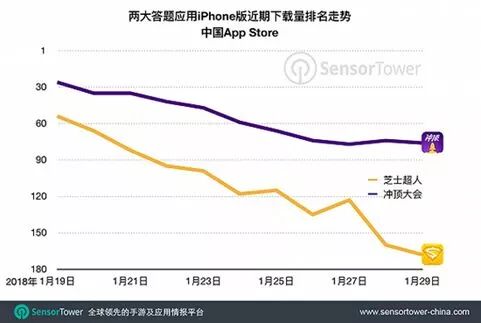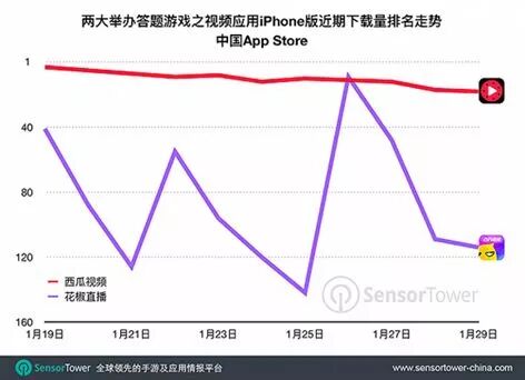 无论是单独APP的“冲顶大会”“芝士超人”还是同时承载其他内容的“西瓜视频”“花椒直播”,在1月下旬的下载量均呈现出明显下滑走势。
