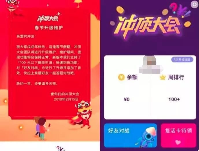 有的则表示升级维护,如《冲顶大会》以升级维护为由,暂停了春节期间的答题活动。总之关于直播答题的APP几乎都无法再打开使用。